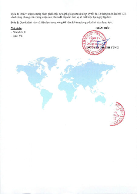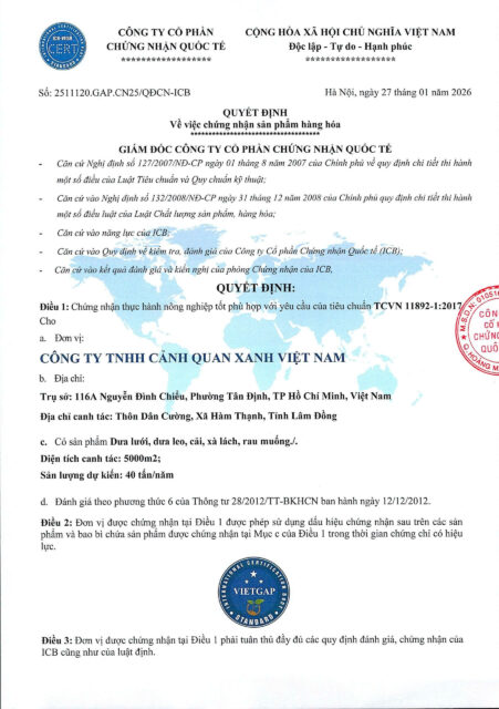 Chứng nhận thực hành nông nghiệp tốt cho sản phẩm dưa lưới, dưa leo, cải xà lách, rau muống do Công Ty TNHH CẢNH QUAN XANH VIỆT NAM sản xuất